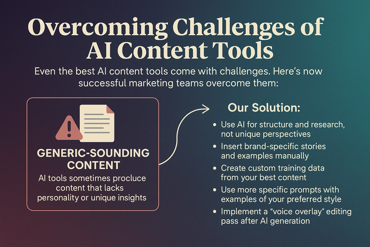 Even the best AI content tools come with challenges. Here’s how successful marketing teams overcome them: