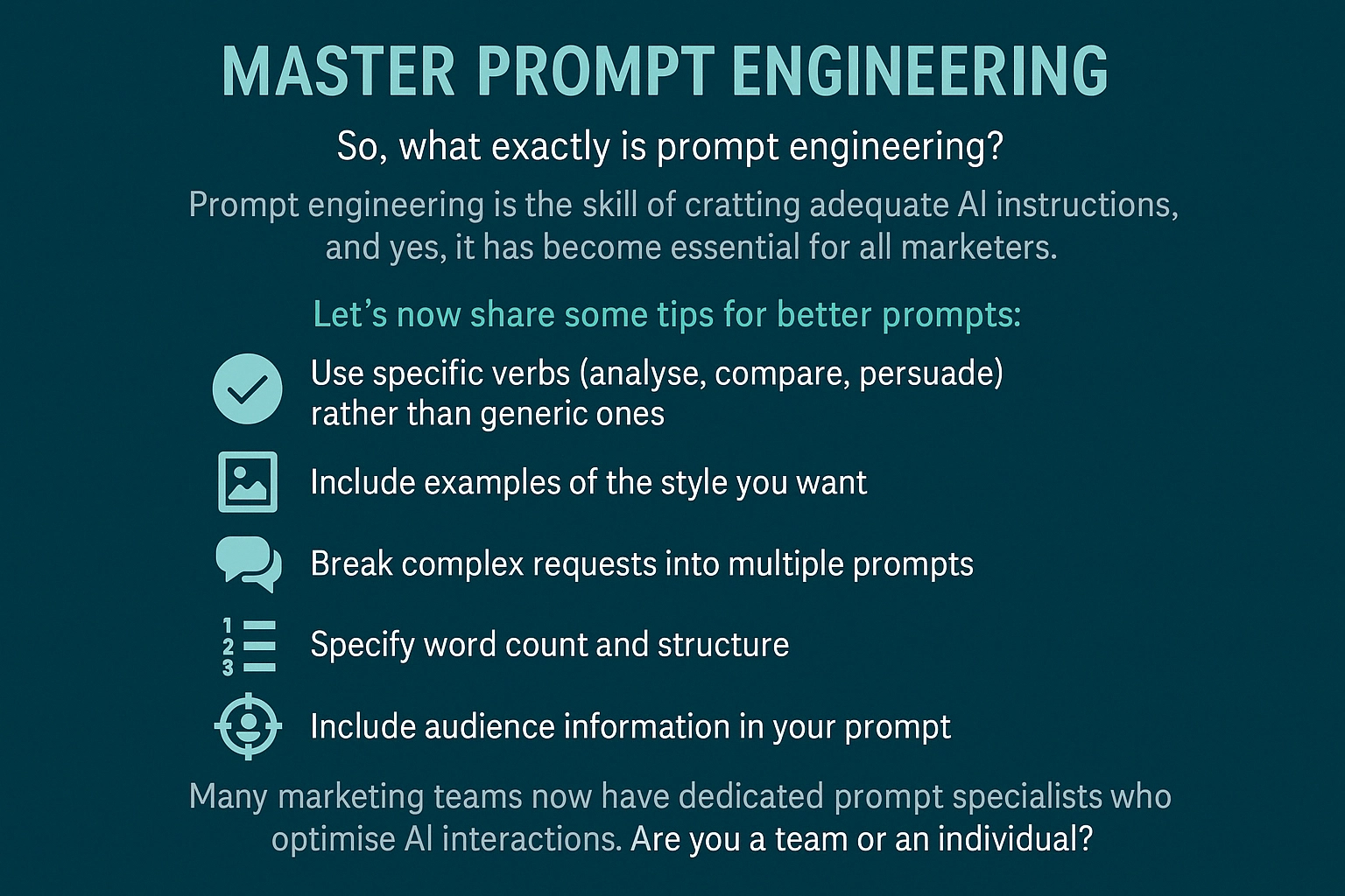 Many marketing teams now have dedicated, prompt specialists who optimise AI interactions. Are you a team or an individual?