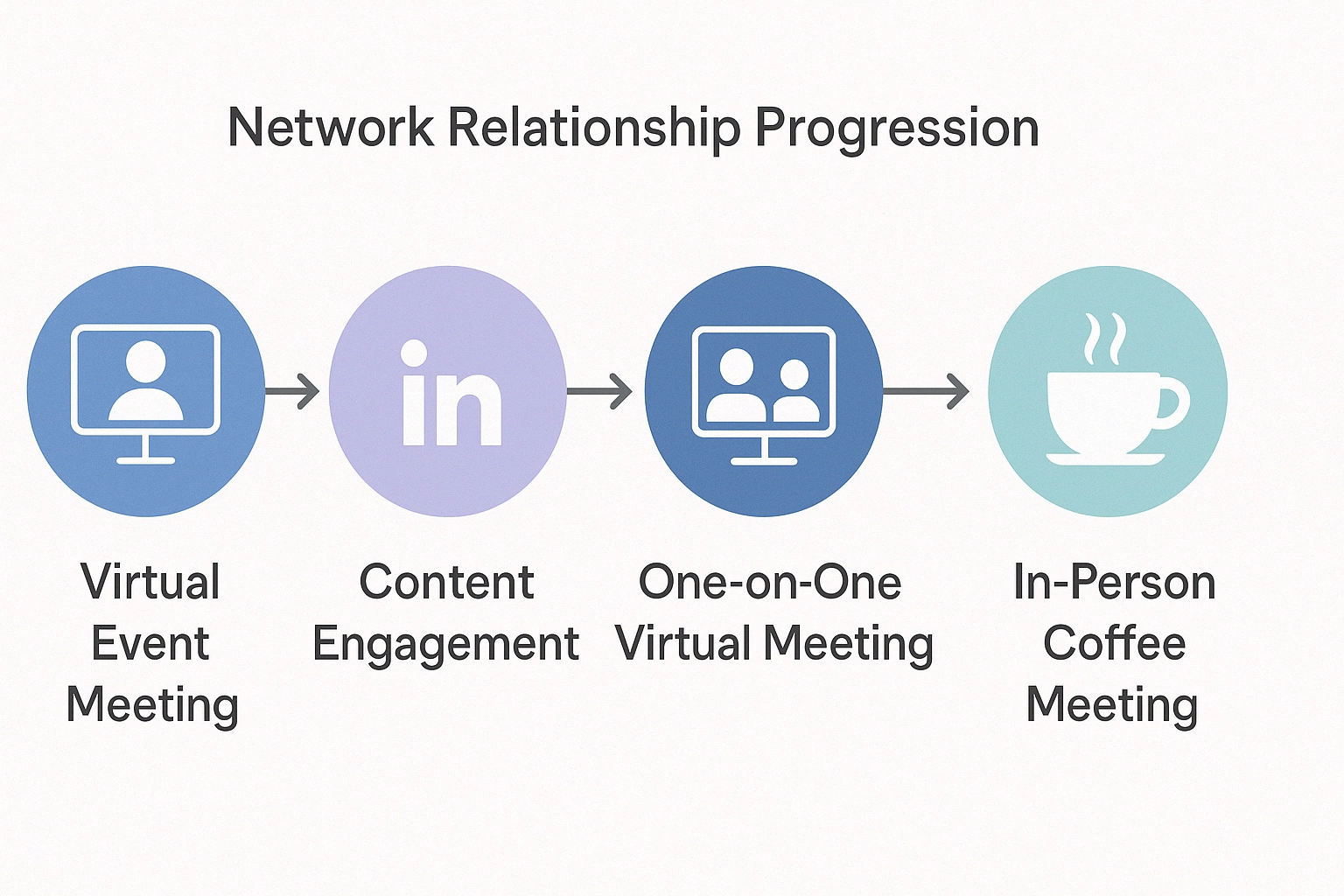 Initial connections made at virtual events might move to asynchronous content engagement, one-on-one virtual coffee meetings, and in-person meetings when geography permits.